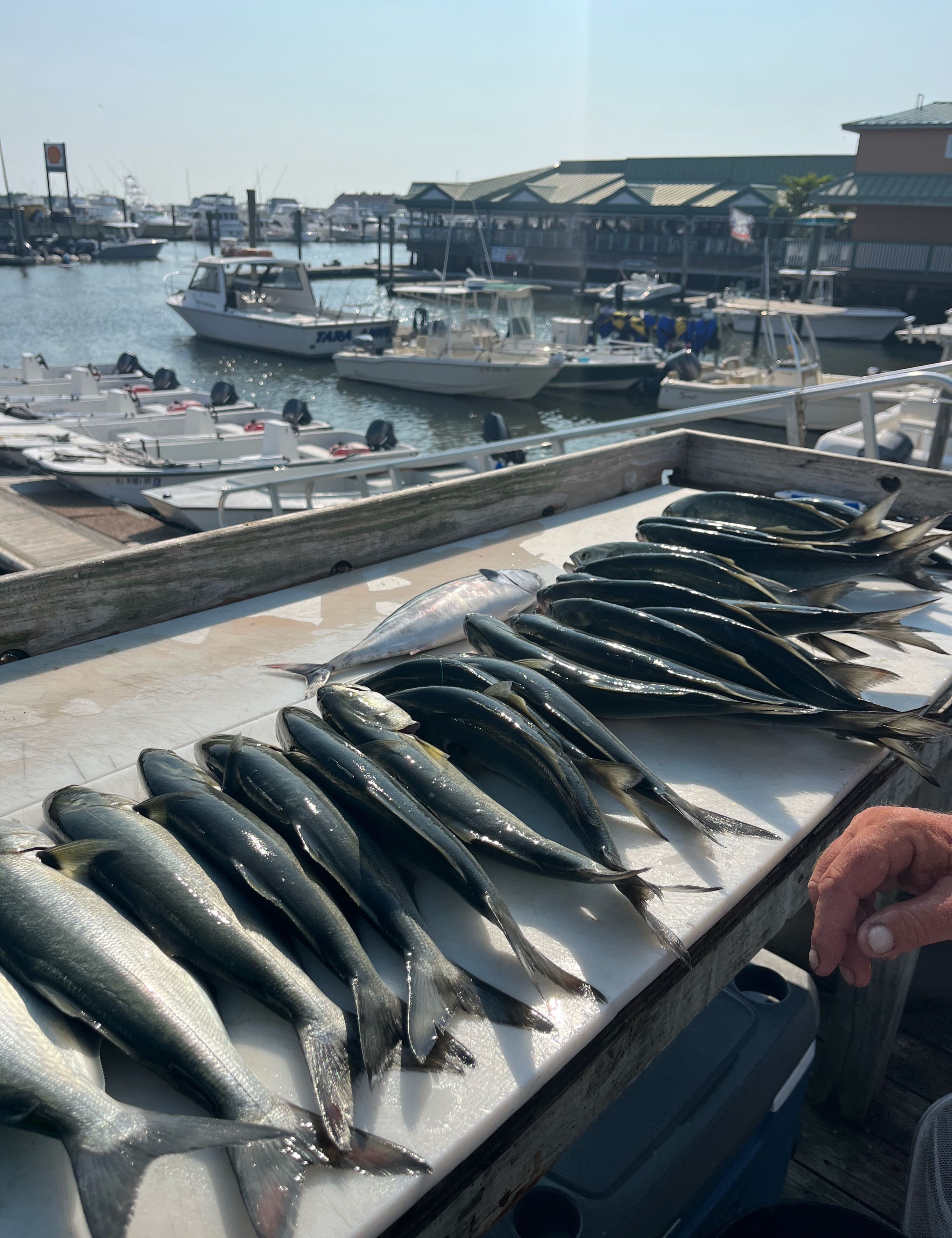 The trolling today was phenomenal on both the morning and afternoon trips. Tons of action 3-4 fish hooked up at a time. We limited out on nice size blue fish both trips.